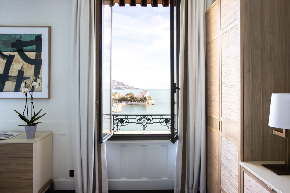 Ici, les murs ornés de papier peints couleur bleu manille évoquent les eaux cristallines de la Méditérranée, tandis que les rideaux en coton égyptien d’un blanc immaculé apportent une touche de pureté. La lumière naturelle qui filtre à travers les fenêtres révèle les nuances délicates de cette teinte, évoquant un ciel azuréen par une journée ensoleillée. La vue sur la Méditerranée et les jardins de l’hôtel invite au désir d’évasion.